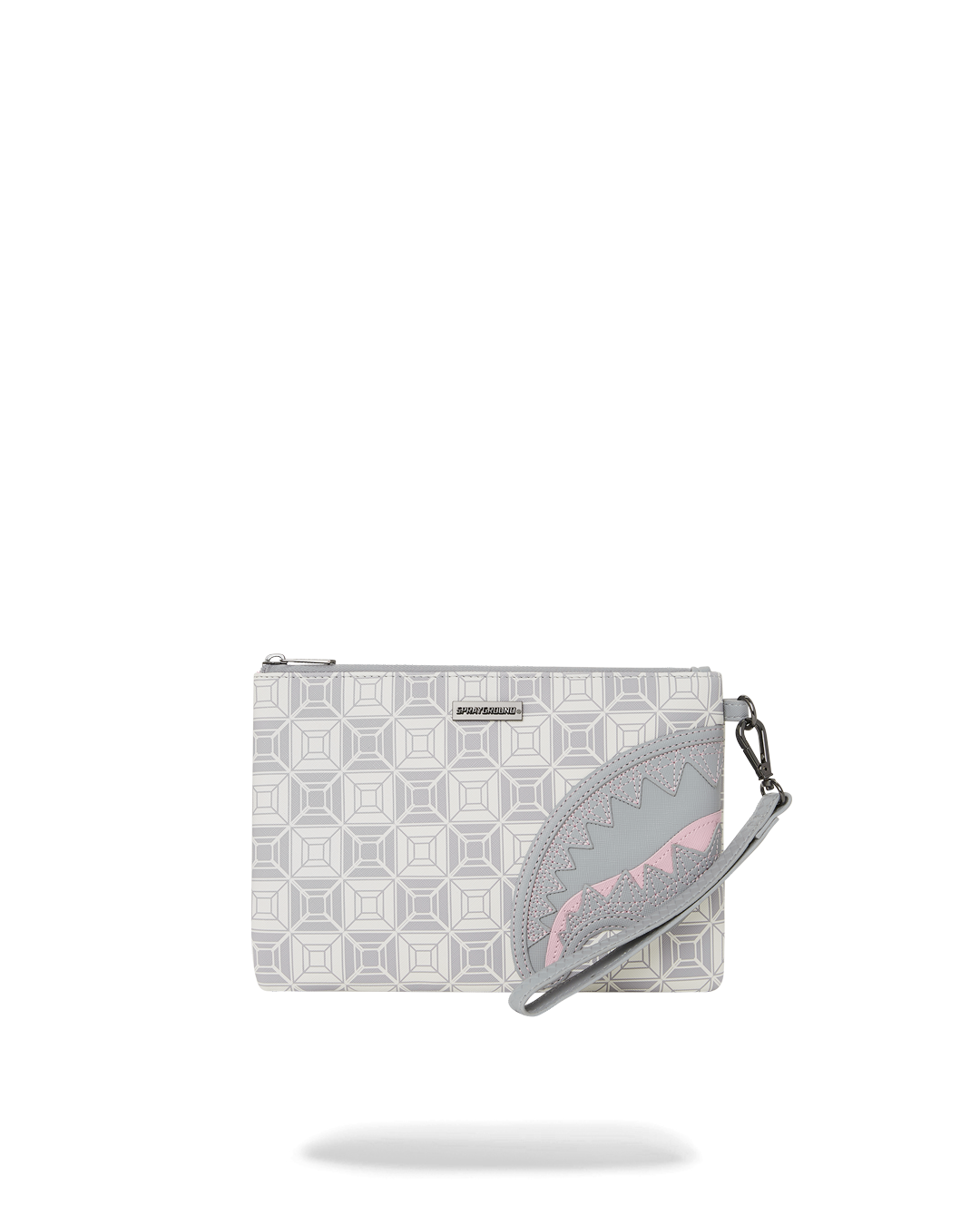 Pouch with removable wristlet strap. Handle on front panel. Zip Closure. secret stash pocket on side seam