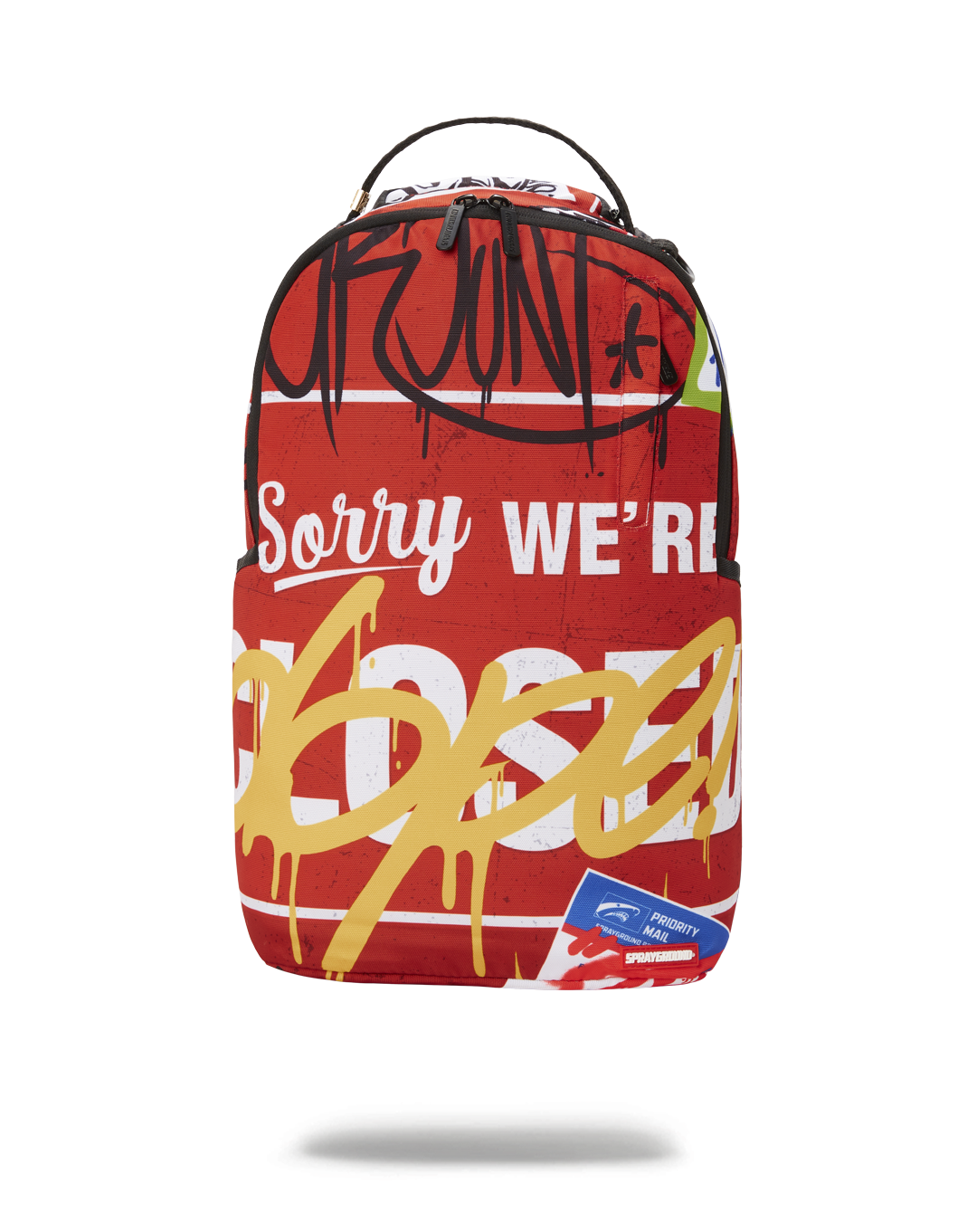 Dimensions: 18" x 6" x 11.5" • Front zipper pocket • Side pockets • Zippered Stash pocket • Separate velour sunglass compartment • Ergonomic mesh back padding • Adjustable Straps for custom sizing • Green zippers with metal hardware • Metal "Sprayground Authentic" badge • Slide through back sleeve connects to carry on luggage to free your hands