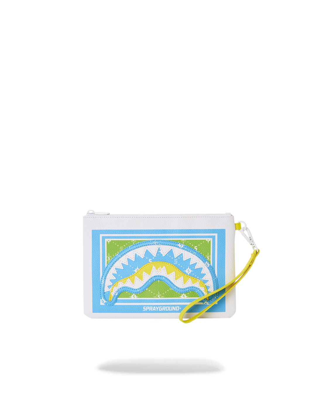 Pouch with removable wristlet strap. Handle on front panel. Zip Closure