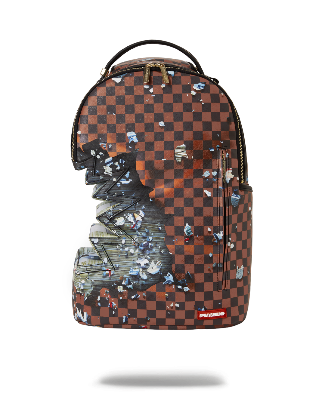 Dimensions: 18" x 6" x 11.5" • Front zipper pocket • Side pockets • Zippered Stash pocket • Separate velour sunglass compartment • Ergonomic mesh back padding • Adjustable Straps for custom sizing • Gold zippers with metal hardware • Metal "Sprayground Authentic" badge • Slide through back sleeve connects to carry-on luggage to free your hands